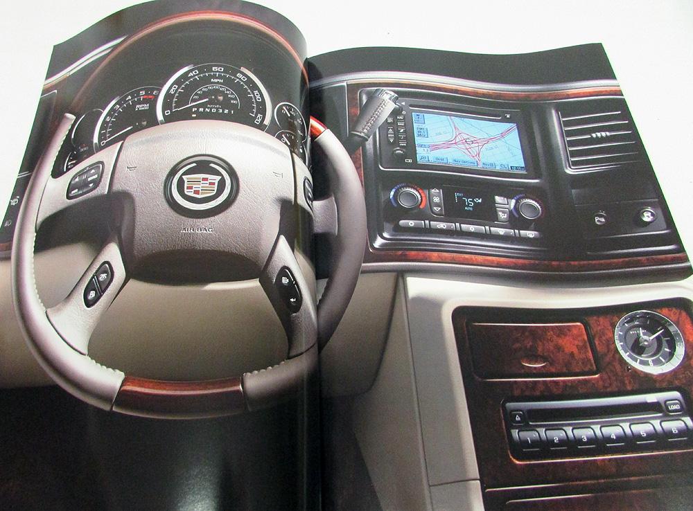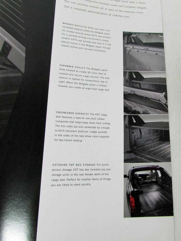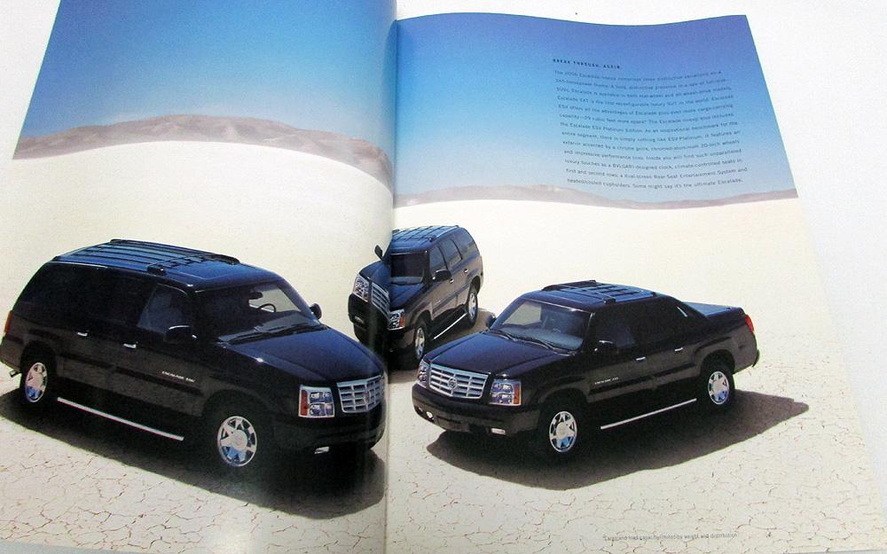 Original over-sized prestige sales brochure for the 2006 Escalade, EXT, and ESV. Glossy photos, vellum overlays, fold-outs of interior configurations, paint chips, specifications and much more. Very good condition. The lower front cover has some very light distress along the bottom edge (see photo).