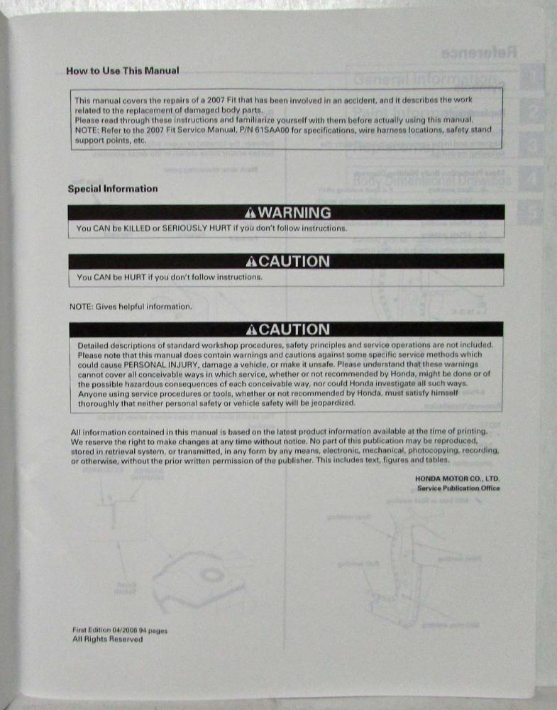 This manual covers the repairs of 2007 Fit that has been involved in an accident, and it describes the work related to the replacement of damaged body parts.