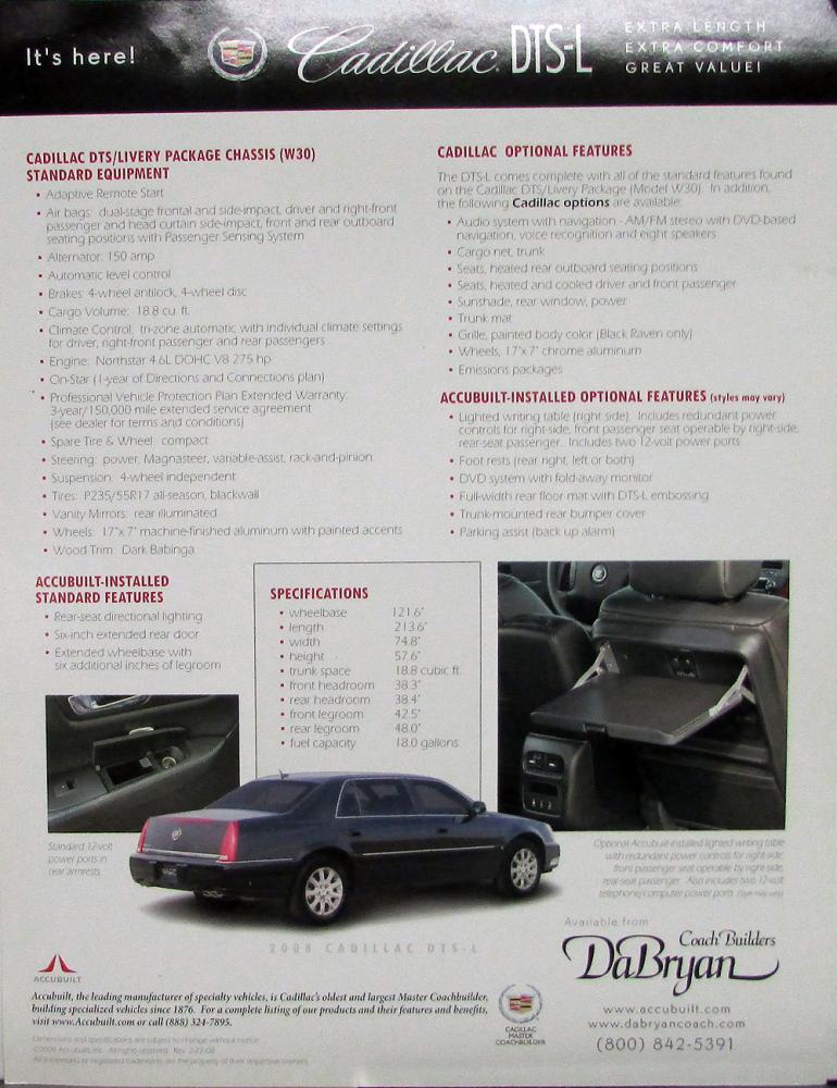 Original 2008 Cadillac DTS-L sales/data sheet (2-sided) by Coach Builders DaBryan. Extra length, comfort and great value! List of standard equipment Livery Package, Accubuilt installed standard features, specifications, optional Cadillac options, and Accubuilt-installed optional features. Very good condition.