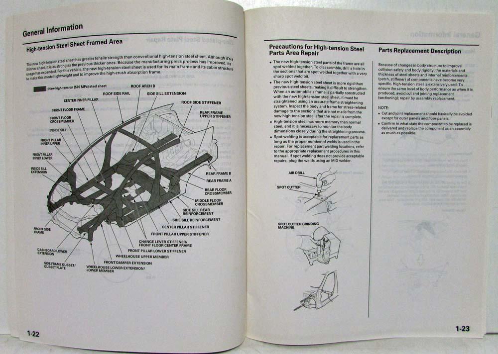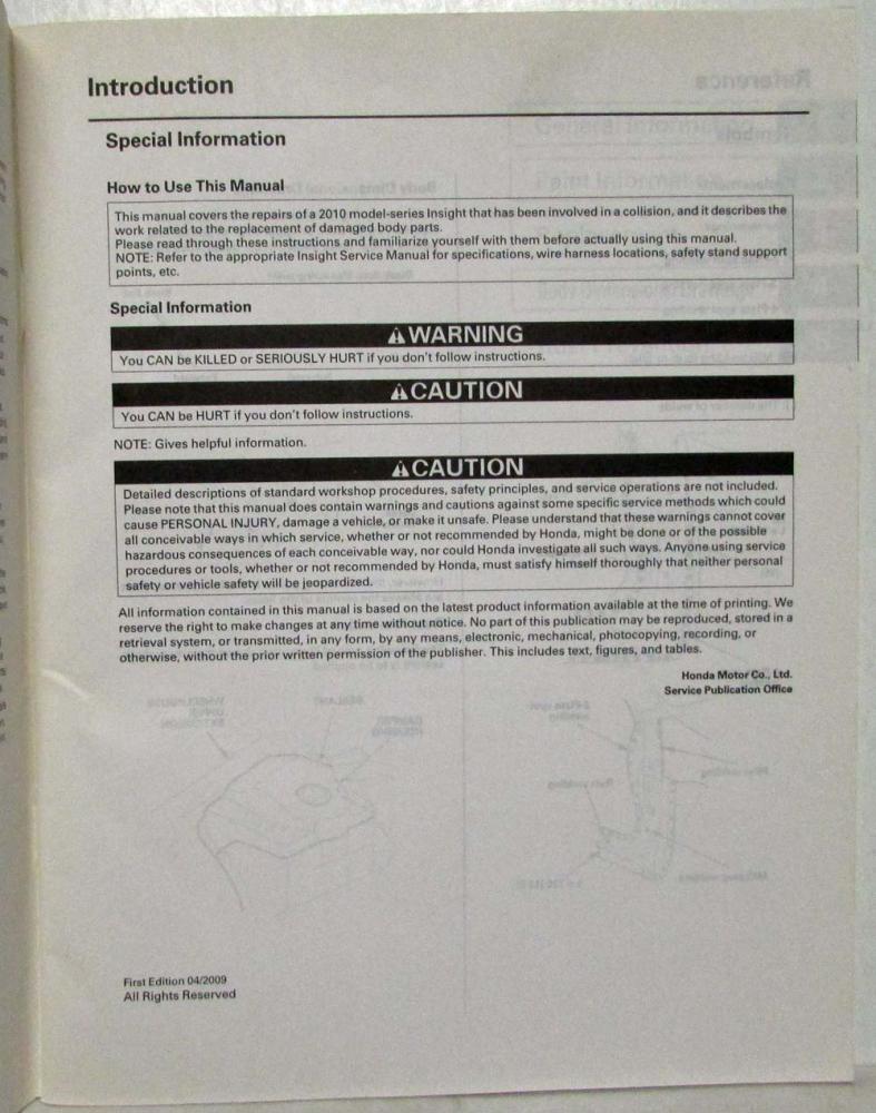 This manual covers the repairs of a 2010 model series Insight that has been involved in an collision, and it describes the work related to the replacement of damaged body parts.