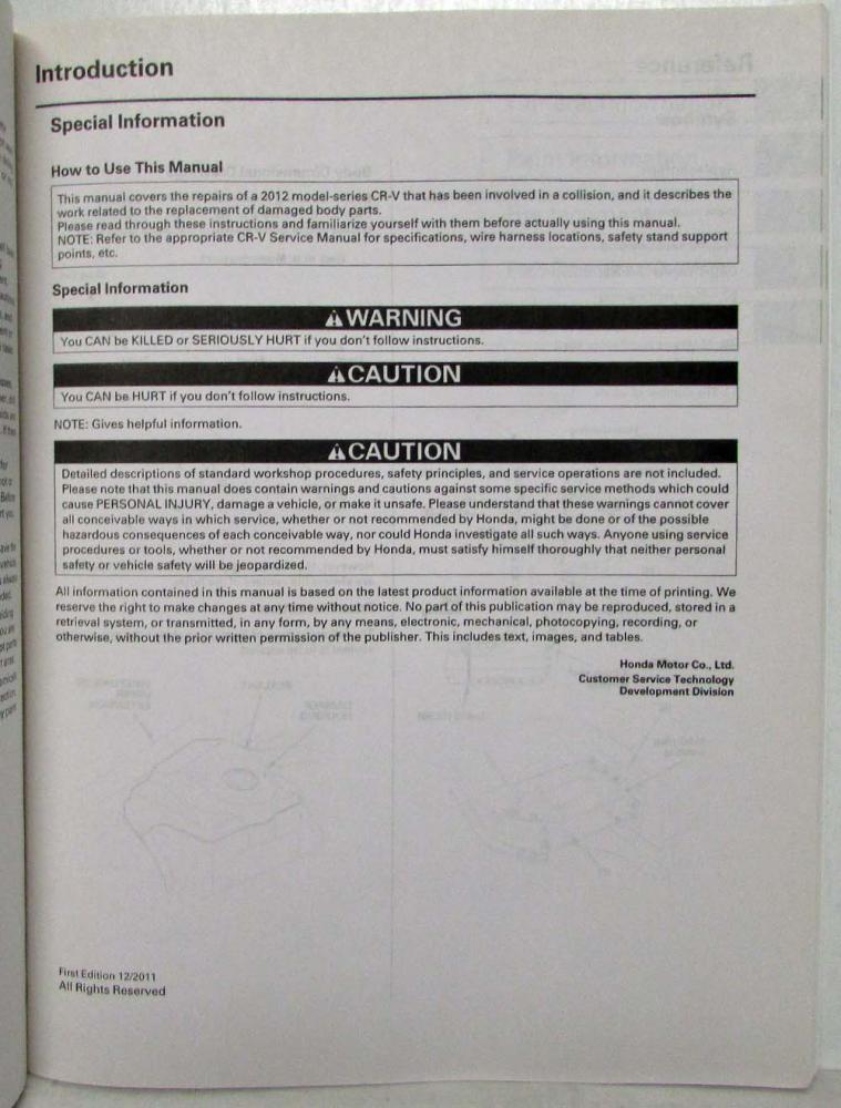 2012 Honda CR-V Body Repair Service Manual. ORIGINAL.