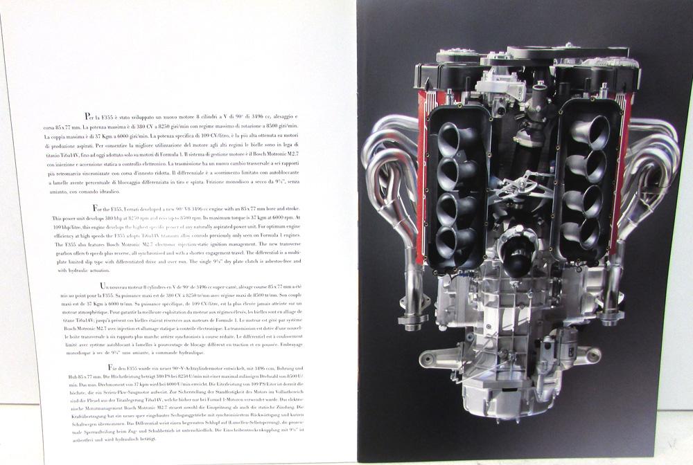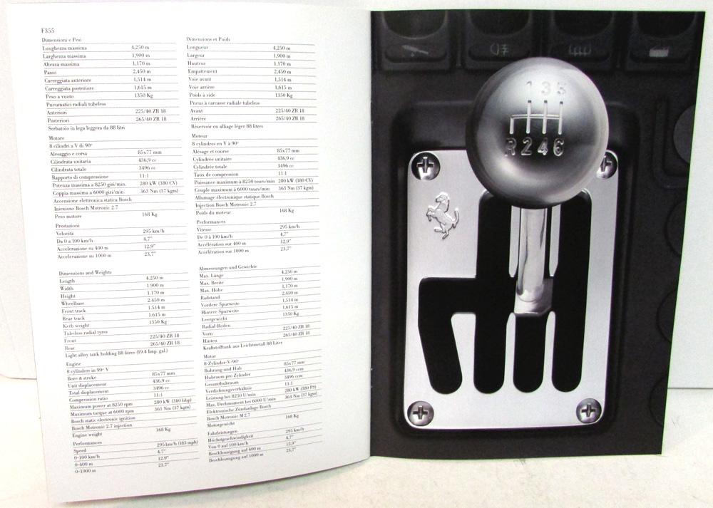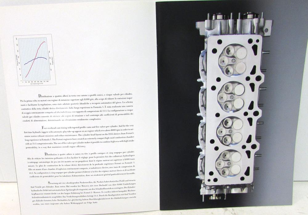 Very nice original 1990's Ferrari F355 Dealer Prestige Sales Brochure with Custom Folder. This beautifully illustrated Brochure is made with heavy card stock glossy paper. It highlights the Features, Options and Specs of the F355 Models. It has Italian Text and was meant for European Markets. The custom folder has the Ferrari Logo and F355 embossed on it. Very rare and informative piece of automotive history that will display well.