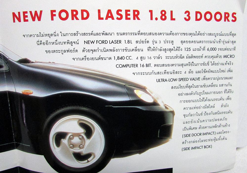 Ford Laser 1.8L 3 Doors Foreign Dealer Sales Brochure. This Folder has Thai Text and is for the Taiwan Market. It is in good condition with minor wear and blemishing [see photos].