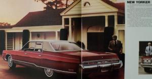 NOS 1974 Chrysler color, dealer sales brochure, over-sized featuring the New Yorker Brougham, New Yorker, Newport Custom, Newport, and Town & Country. Nice, crisp, colorful photos of cars, seating & dash interiors. Standard and optional features and equipment information provided, and specifications.