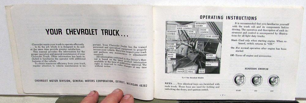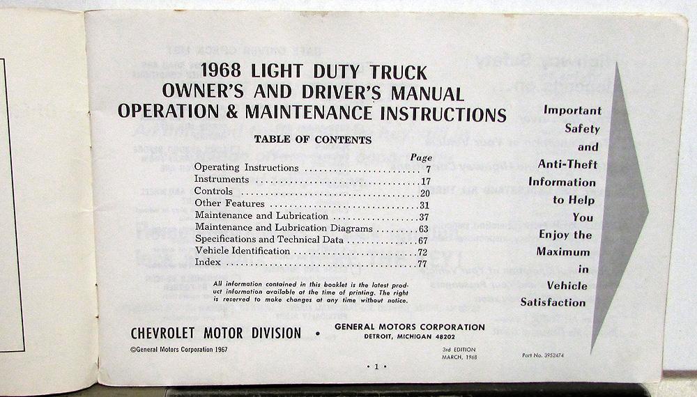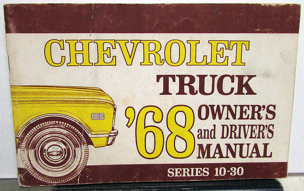 Original 1968 Chevrolet truck owners manual for 10-20-30 Series C & K models. This manual contains operating instructions, maintenance and service specifications for this vehicle. It is in good condition with minor wear and soiling [see photos].