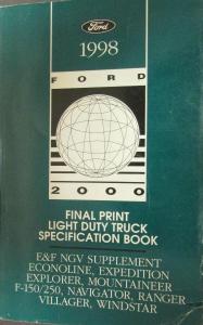 Original, 1998 Ford Light Duty Truck Service Specifications handbook/manual contains information normally not found in the service manuals or owner's manuals. Models included are Econoline, Expedition, Explorer, Mountaineer, Navigator, Ranger, Villager, Windstar, and F-Series -150, -250. Information primarily consist of measurements, sizes, dimensions, quantities, etc. with relationship to brakes, suspension, transmission, engine, ignition system, fuel system, lighting system, etc.