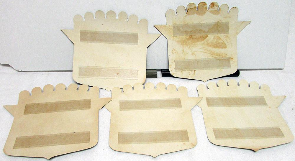 Original set of 5 unused Cadillac Dealer Showroom Window Stickers. These shiny "foil" on cardboard Cadillac Logo Cutouts have 2 pieces of tape on back to affix to Car or Dealership Windows or Displays. They are in very good condition with minor wear and blemishing and will display well [see photos]. They will be a great addition to any Collection.