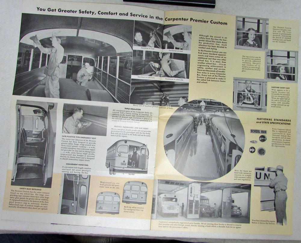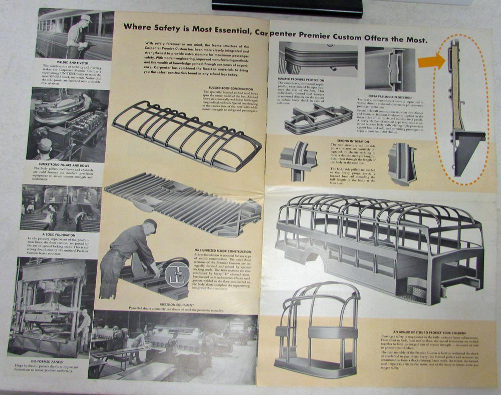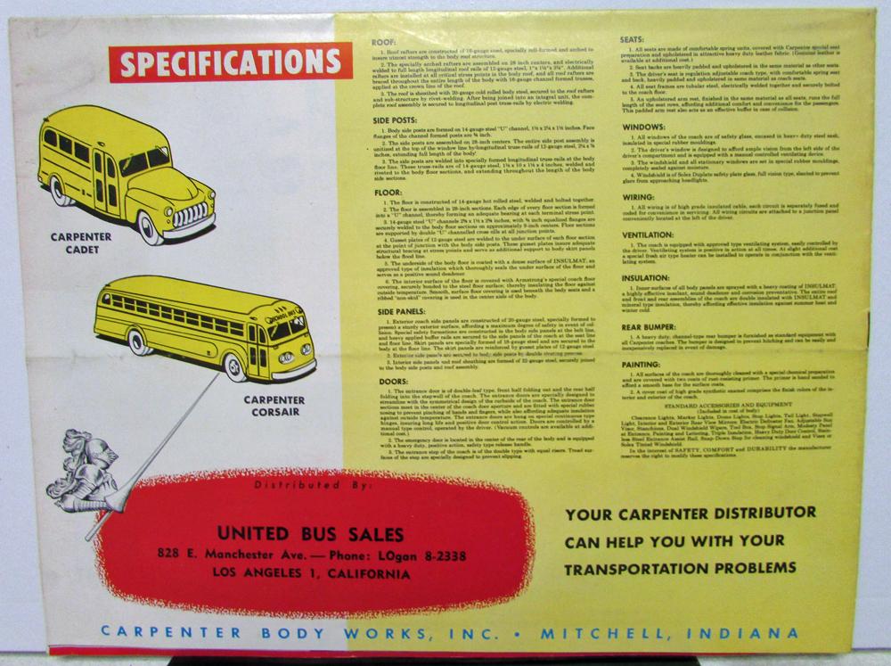 Vintage original Carpenter School Bus Custom Body Dealer Sales Brochure. This well illustrated Brochure highlights the Premier Custom Coach Carpenter School Bus Bodies that were available. Very rare Brochure in good condition from United Bus Sales in LA, California.